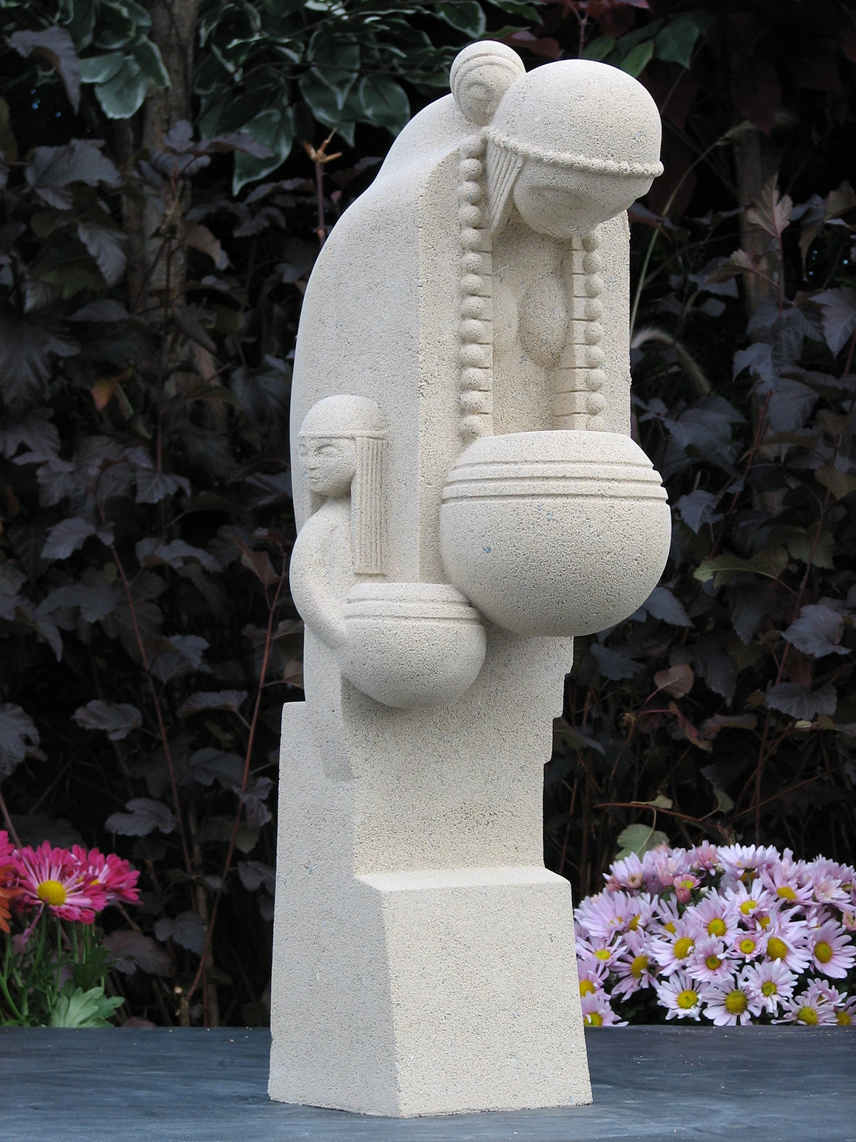 The Nakoma sculpture is a curvilinear design, symbolic of the earth and Mother Nature as well as domestic virtue. her back is a continuous circle, with a round head and she holds a round bowl. Nakoma also carries a papoose and has a child at her side.