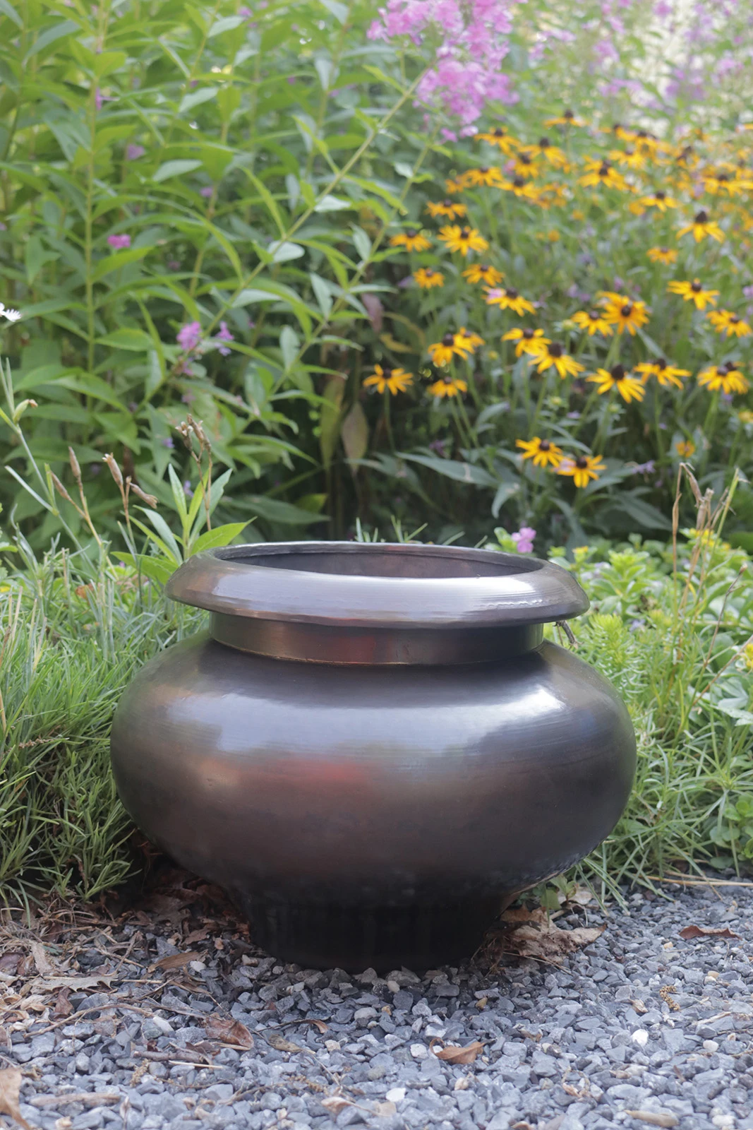 Fluid lines and a rich, mellow finish give the Arzu Greek style solid brass urn a rustic yet sophisticated appeal. At home in a relaxed garden setting or on a formal front porch, highlighting a fiddle-leaf fig in the library or a boston fern in the foyer, the Arzu will artfully complement its environs. Generous 24” size accommodates large houseplants such as palms, ficus, and dracaena and offers ample room for shrubs or mixed container designs outdoors; charming 12” size enhances almost any indoor plant, from philodendron to orchids to bromeliads to ferns and is stunning on a shady stoop filled with begonias, caladium, or impatiens.