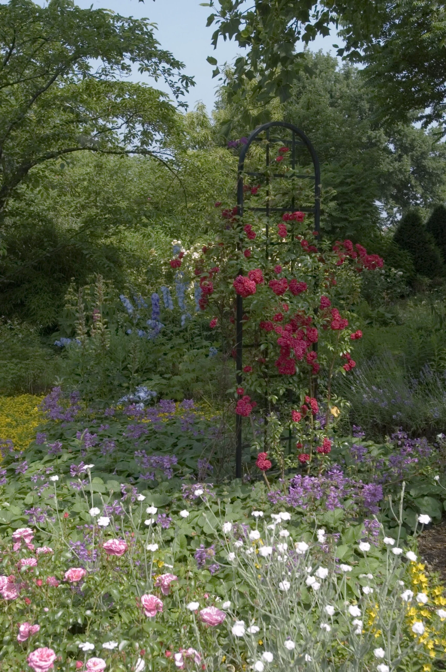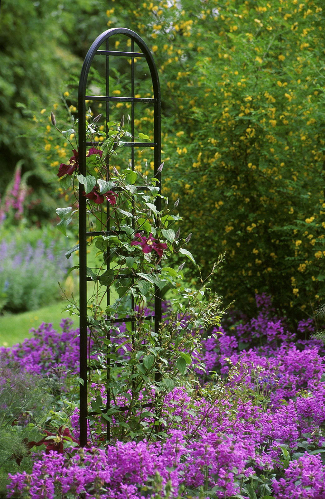 The Burlington Garden Trellis has a solid anchoring spike that enables this trellis to stand without any further anchoring. Made from heavy steel bands and steel tubing welded together as one piece. The trellis is then hot-dip galvanized and subsequently powder coated black.