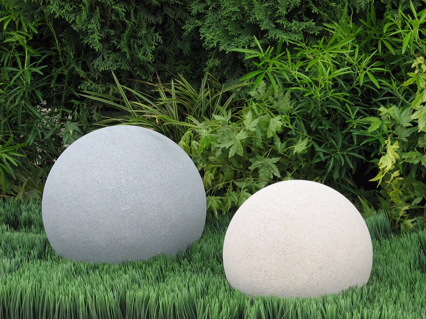 Garden spheres hand-cast using a dry mix technique resulting in the look and feel of sandstone not achievable with poured concrete products. The bottoms are more flattened and can be drilled and staked for stability.