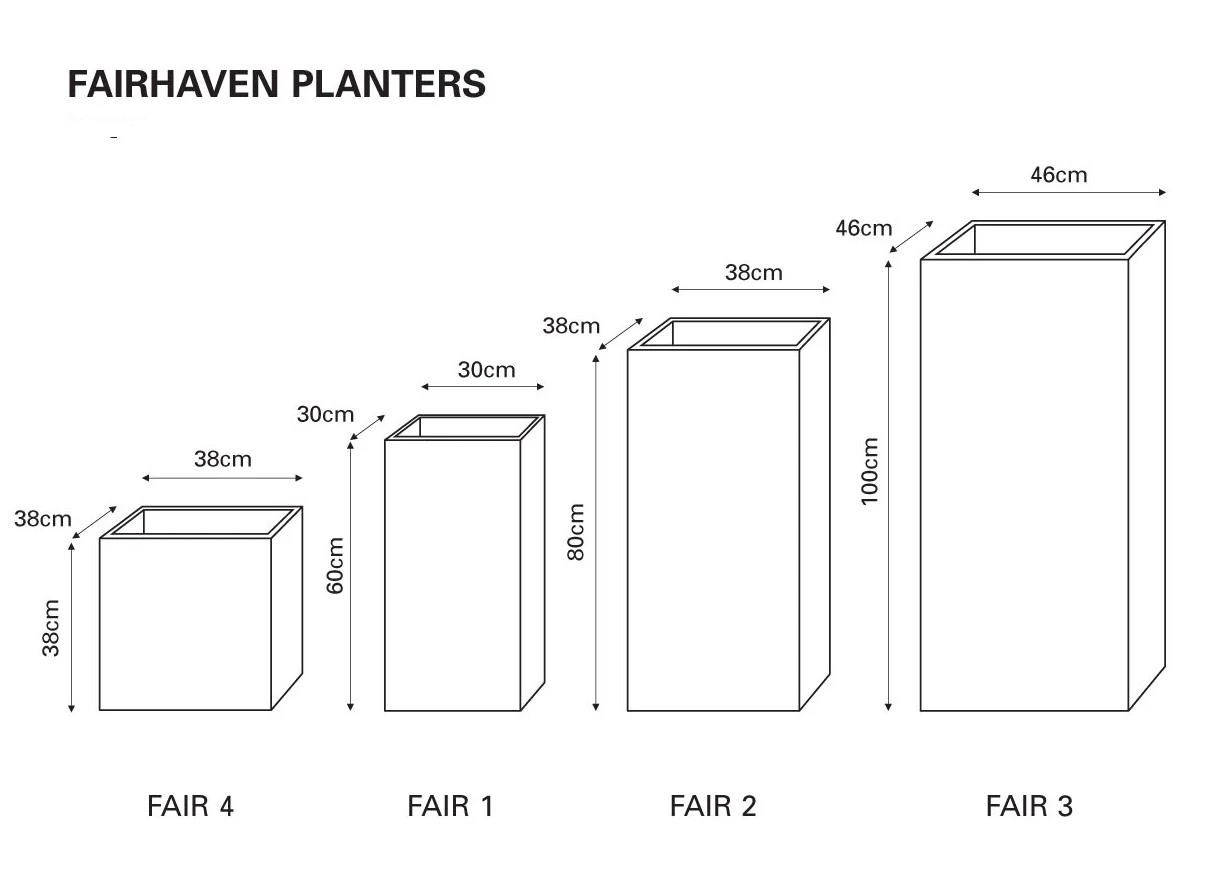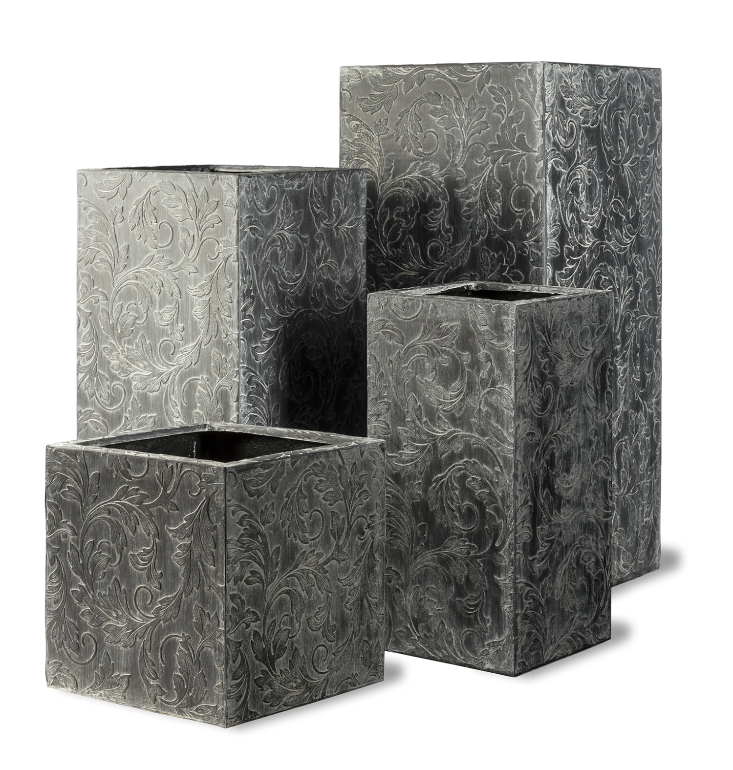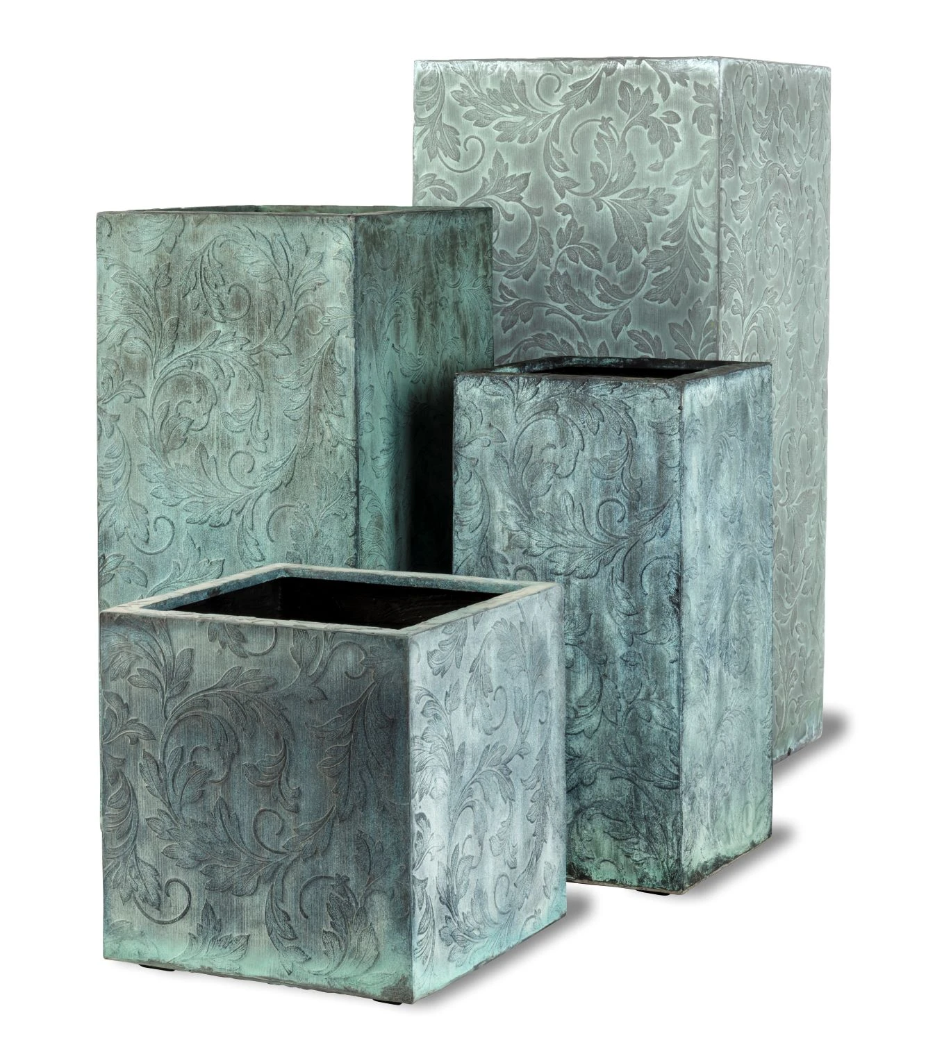 The Fairhaven planters are tall square fiberglass planters with textured botanical design. Offered in five sizes including one tall rectangular style planter.
