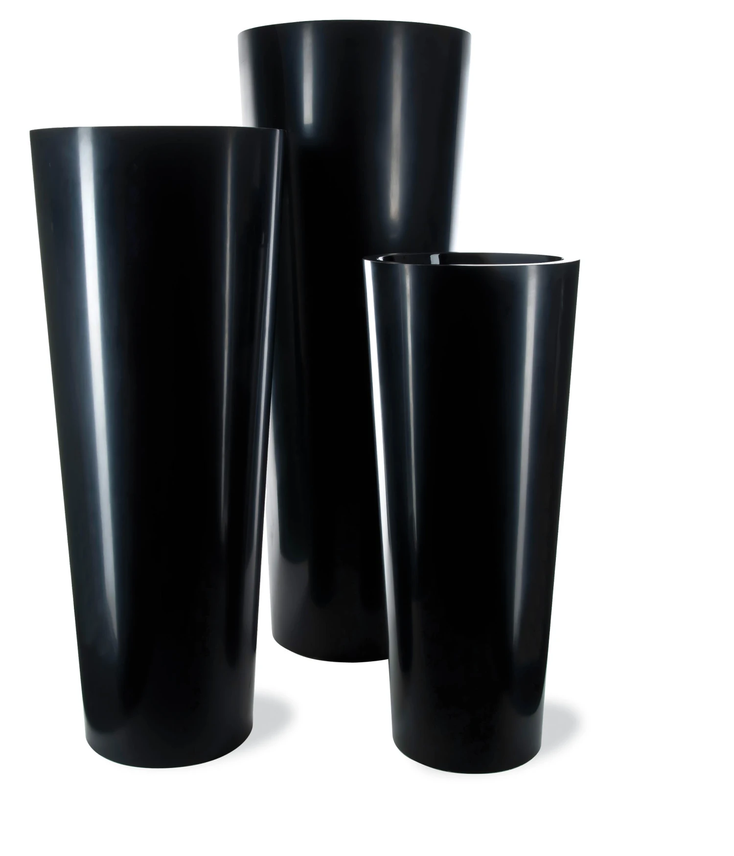 The Geo Cone fiberglass planter is a tall slender round tapered planter ranging in heights of 31″ to 47″. Offered standard in Gloss Black.