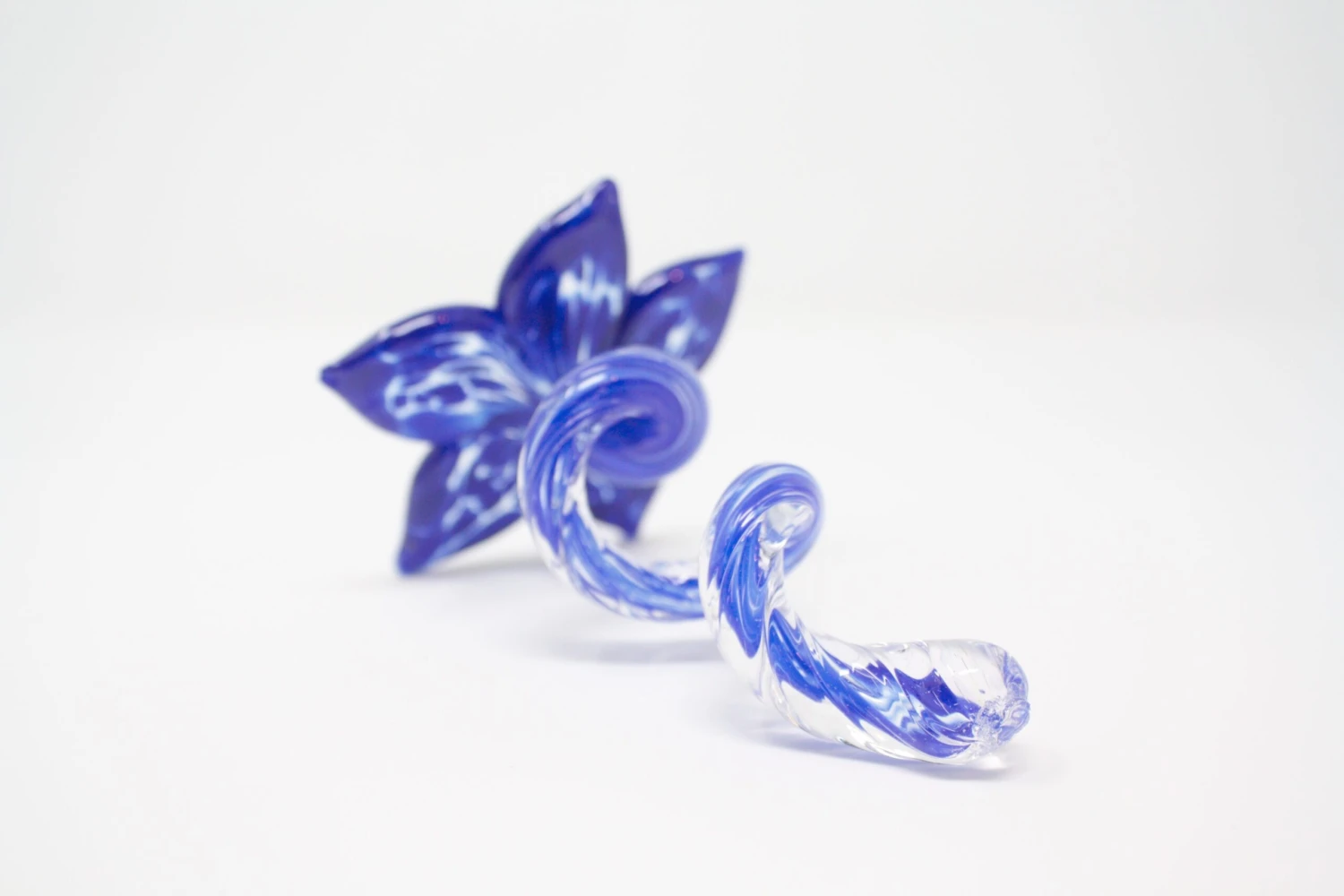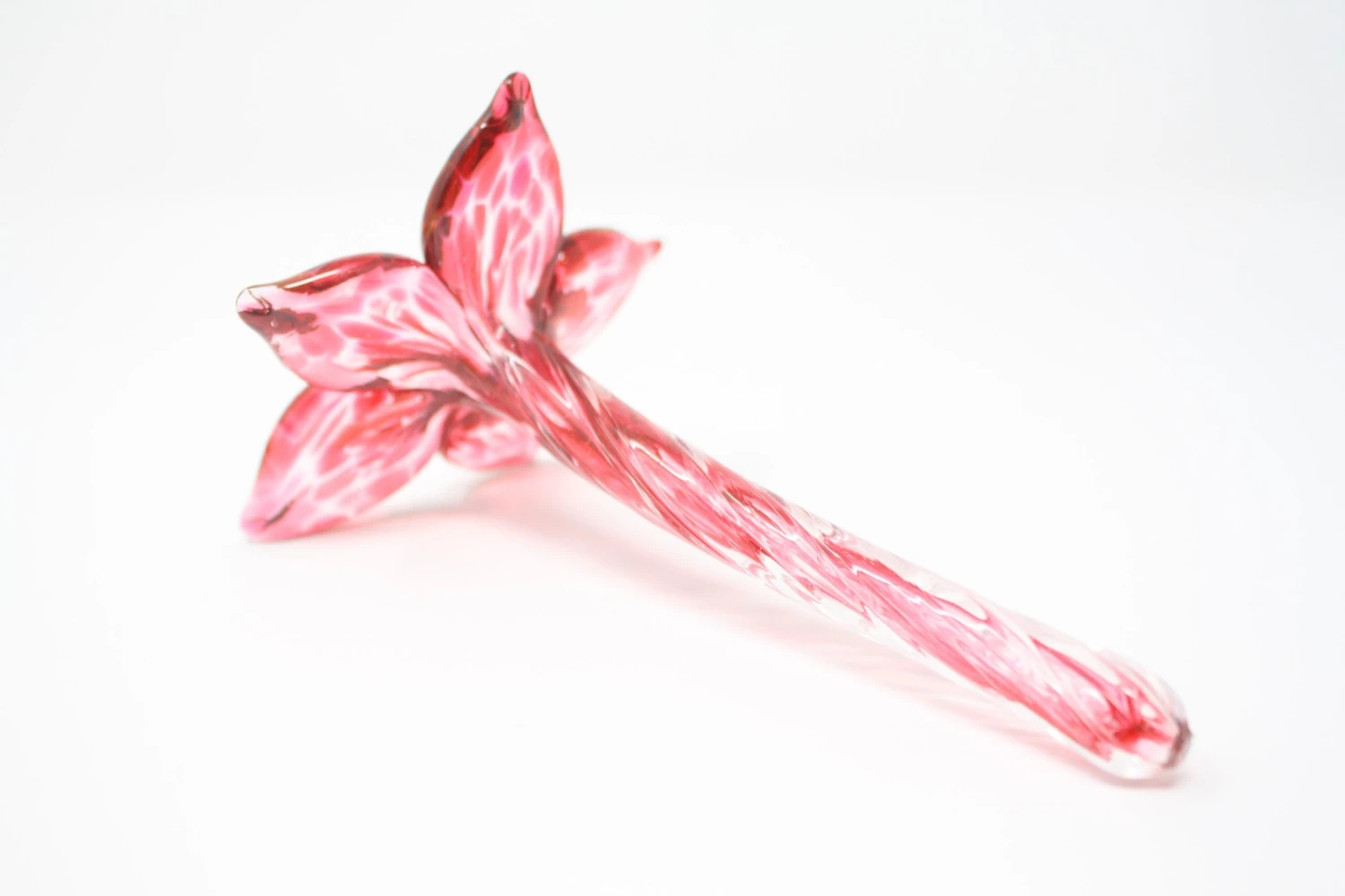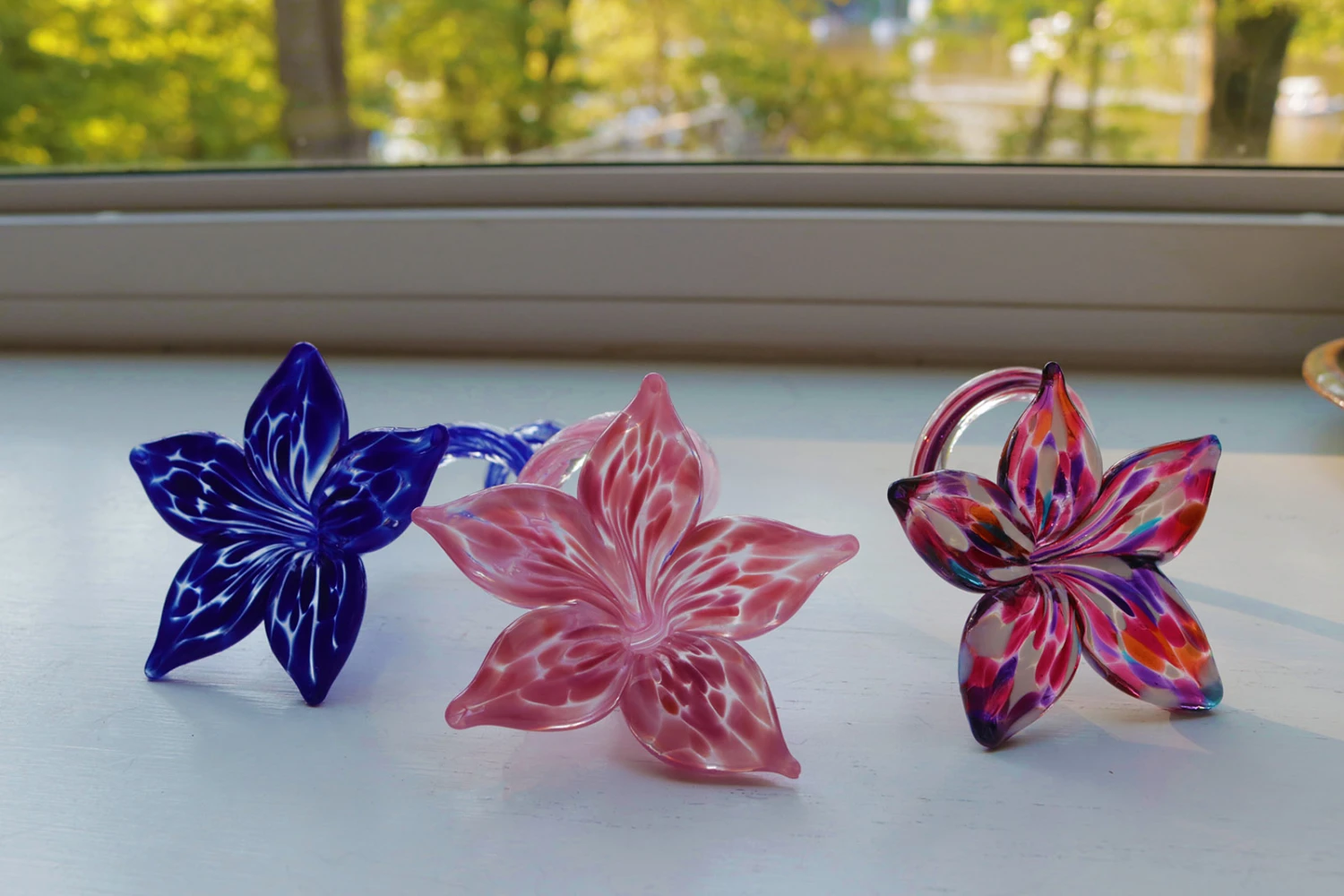 Delicate petals of glass flowers hand crafted by glass artist Maggie Bean. Blown with curly or straight stems and offered in many colors.