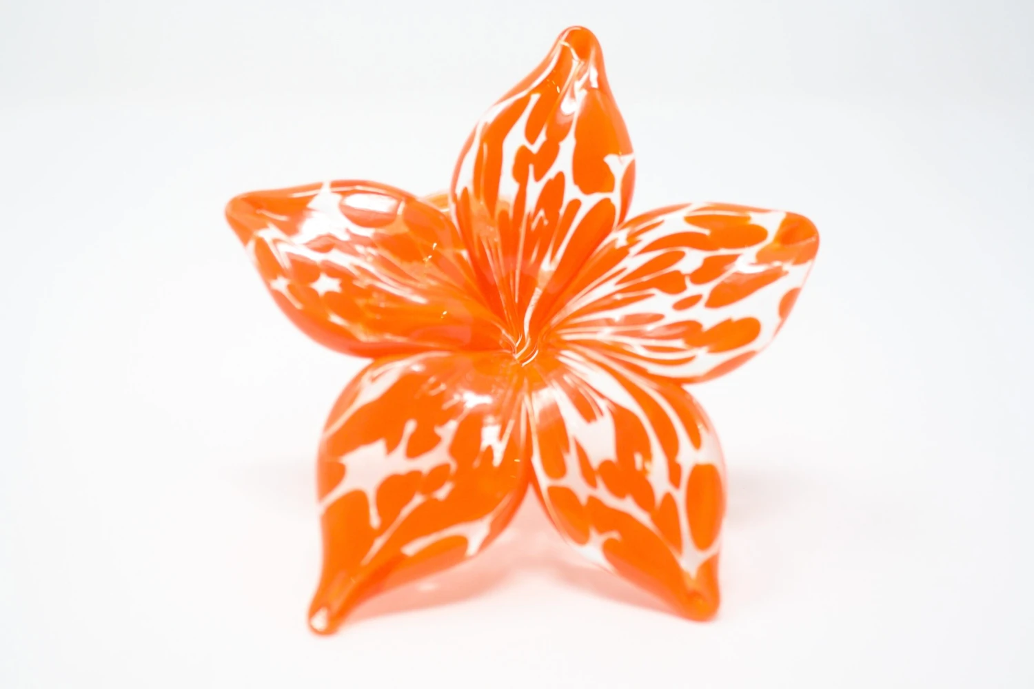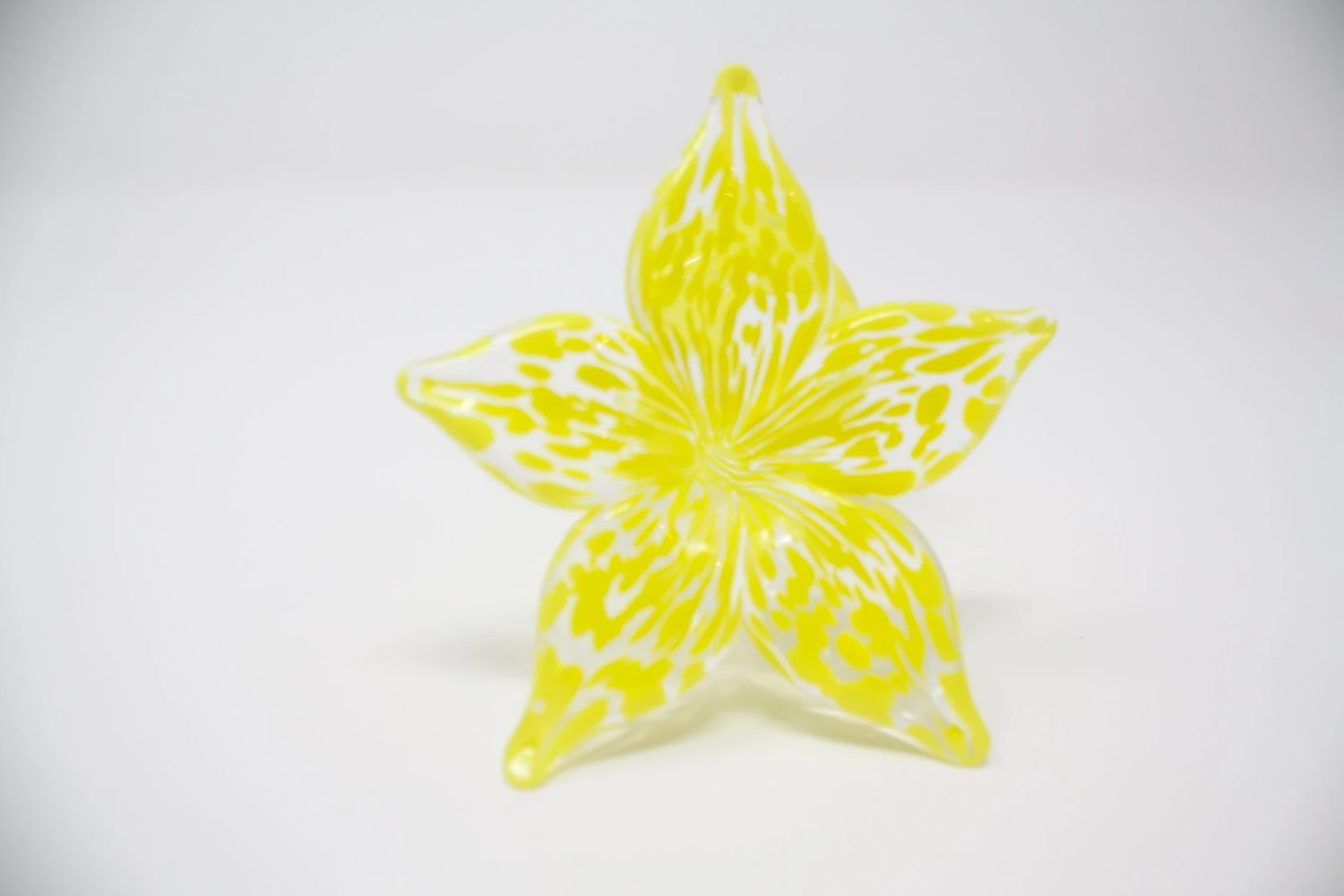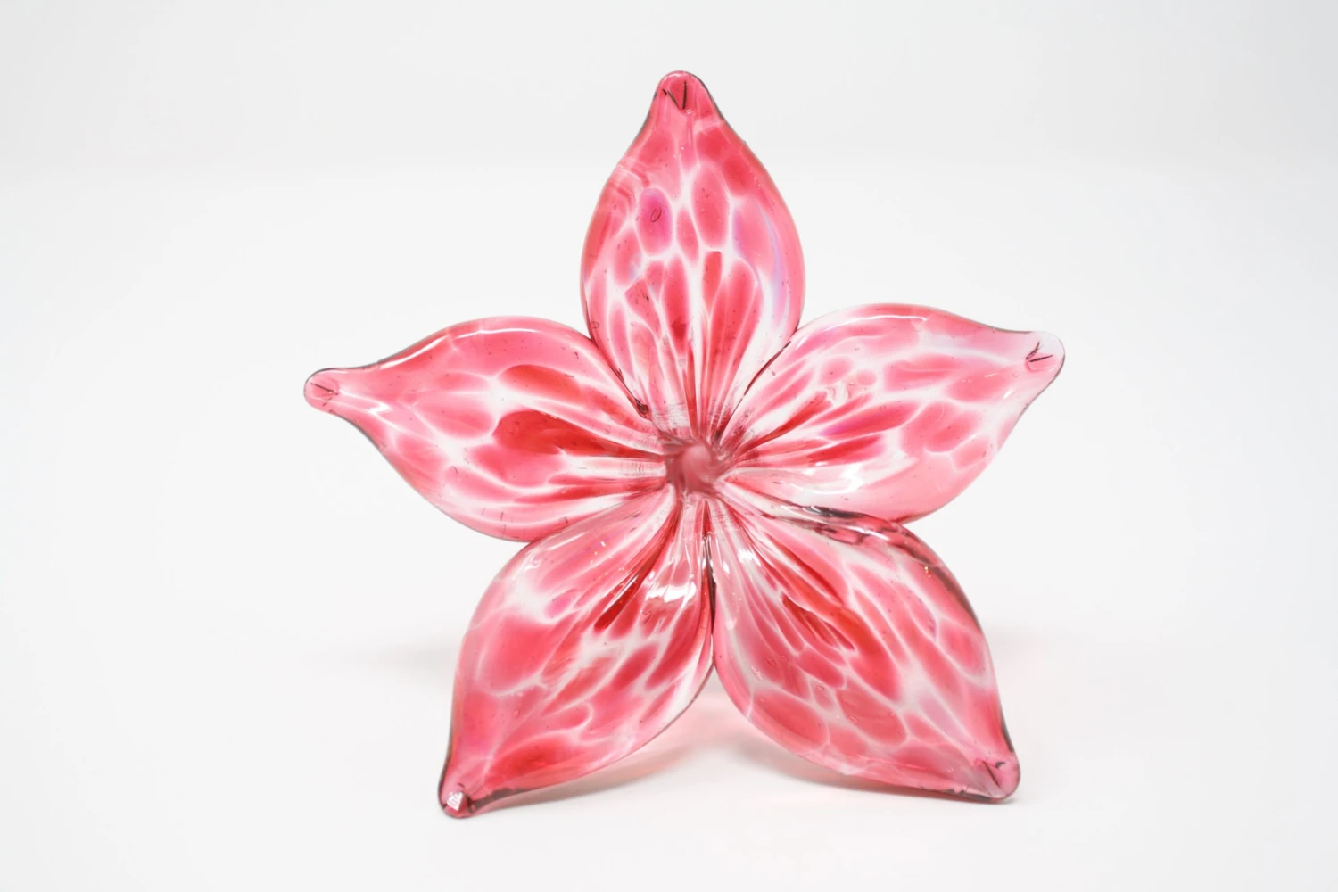 Delicate petals of glass flowers hand crafted by glass artist Maggie Bean. Blown with curly or straight stems and offered in many colors.