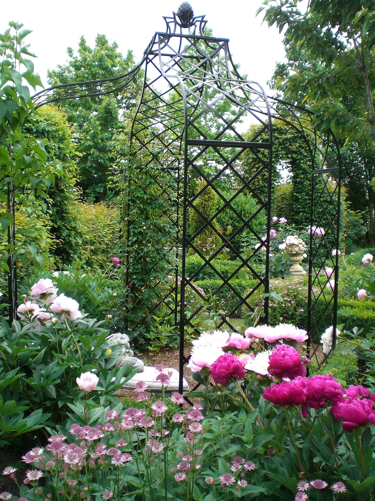 The Kiftsgate Gazebo is a very solid, sturdy frame for all those fragrant, colorful climbers: roses, honeysuckle and clematis. A cherished retreat for that special “blue hour”. It is a place to unwind, to relax, to read. Indeed a refuge to enjoy all that what gardening is about.