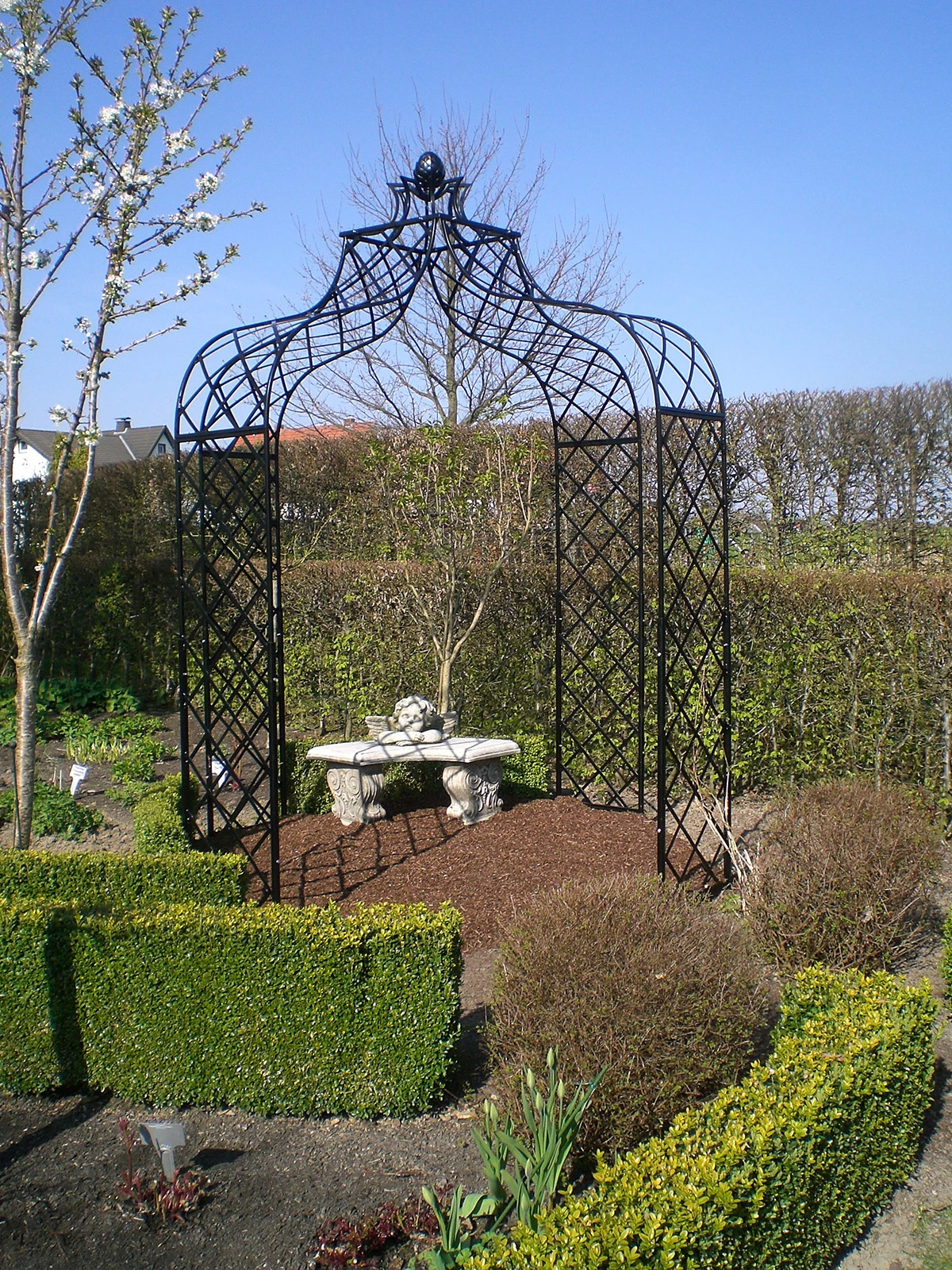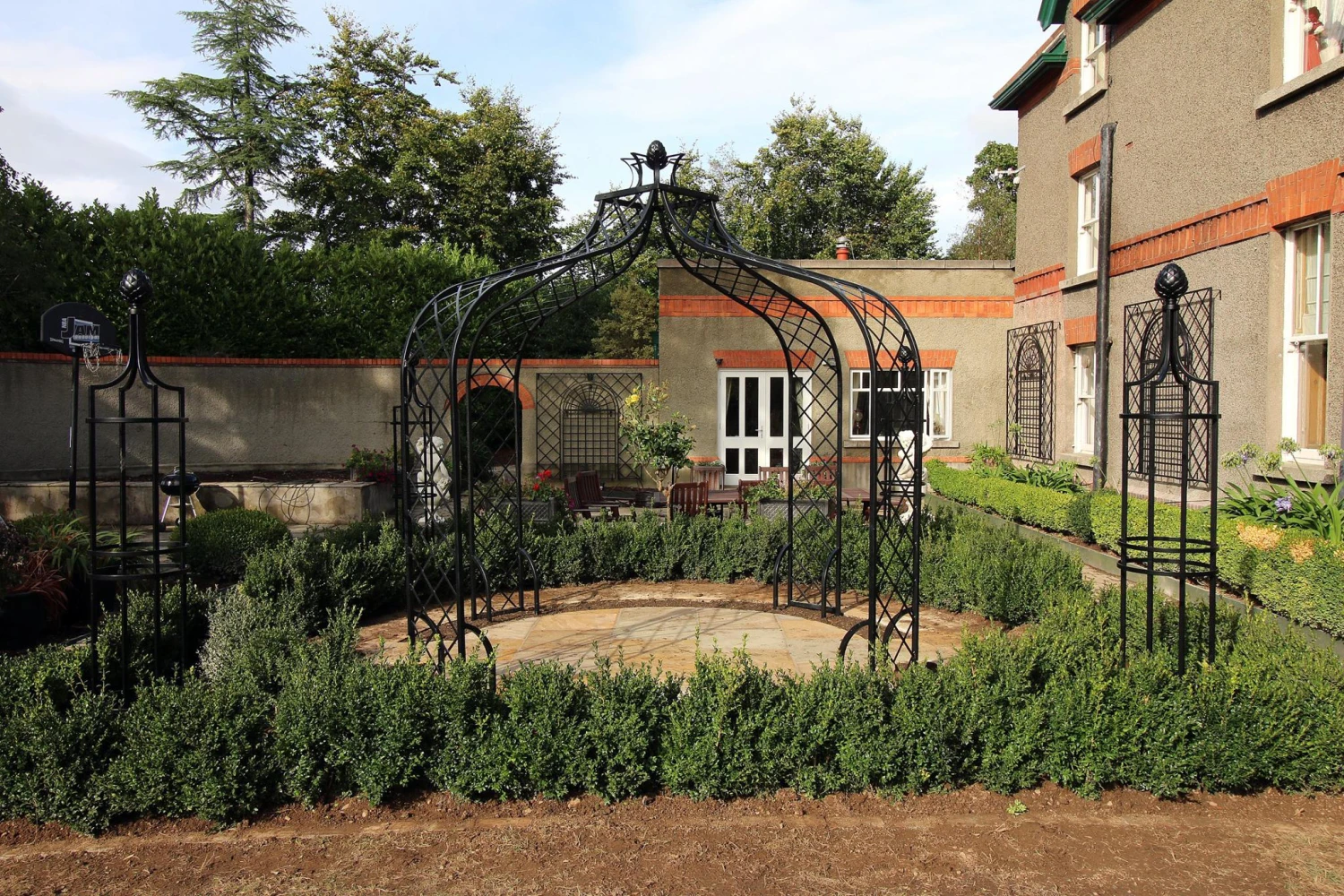 Delivered with the necessary anchoring systems (steel ring with spikes and holders for the side trellises to be put in concrete). Assembly and installation should be organized by a professional landscaper. Bespoke items possible, made to your size and requirement. 10 years guarantee against rust.