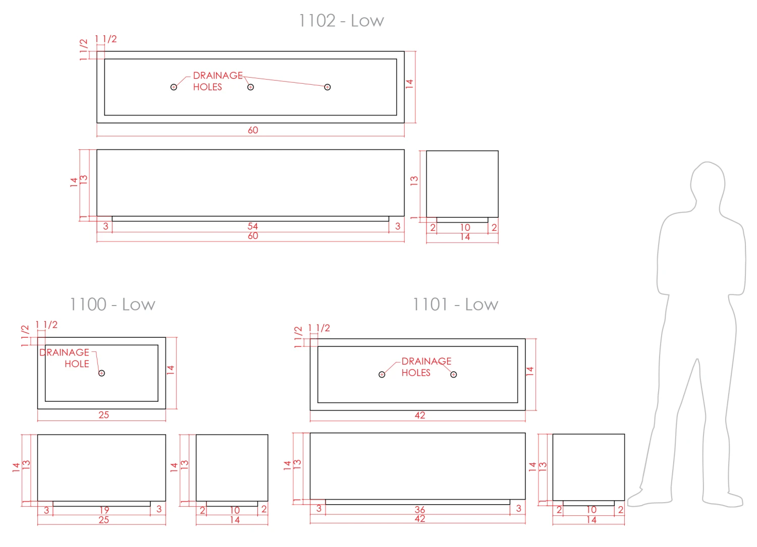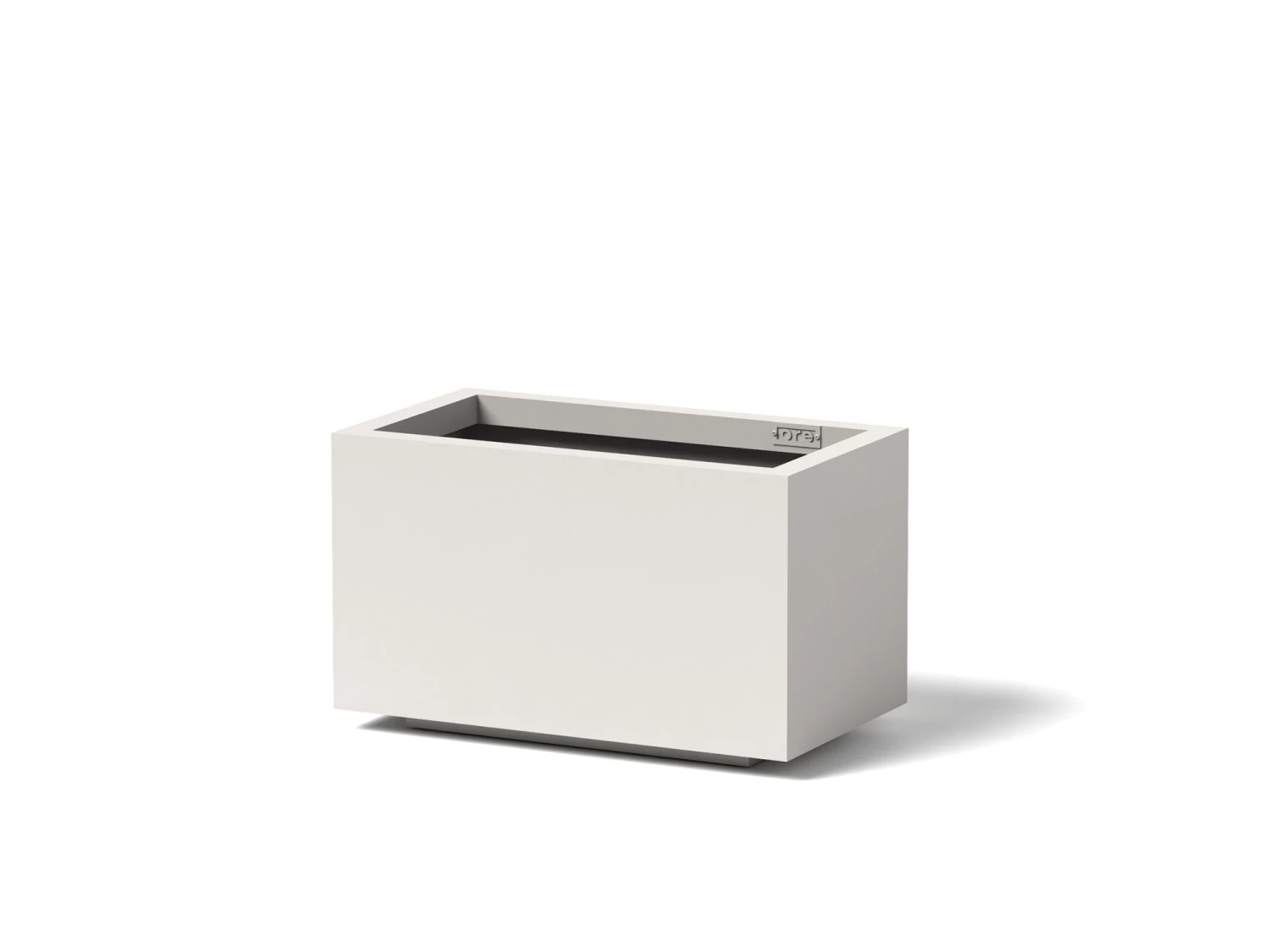 The Low Rectangle planter may be crafted in lightweight aluminum, steel or Cor-Ten steel. 10 standard finish choices as well as custom powder coating. Available lengths: 25in, 42in, 60in x 14in high.