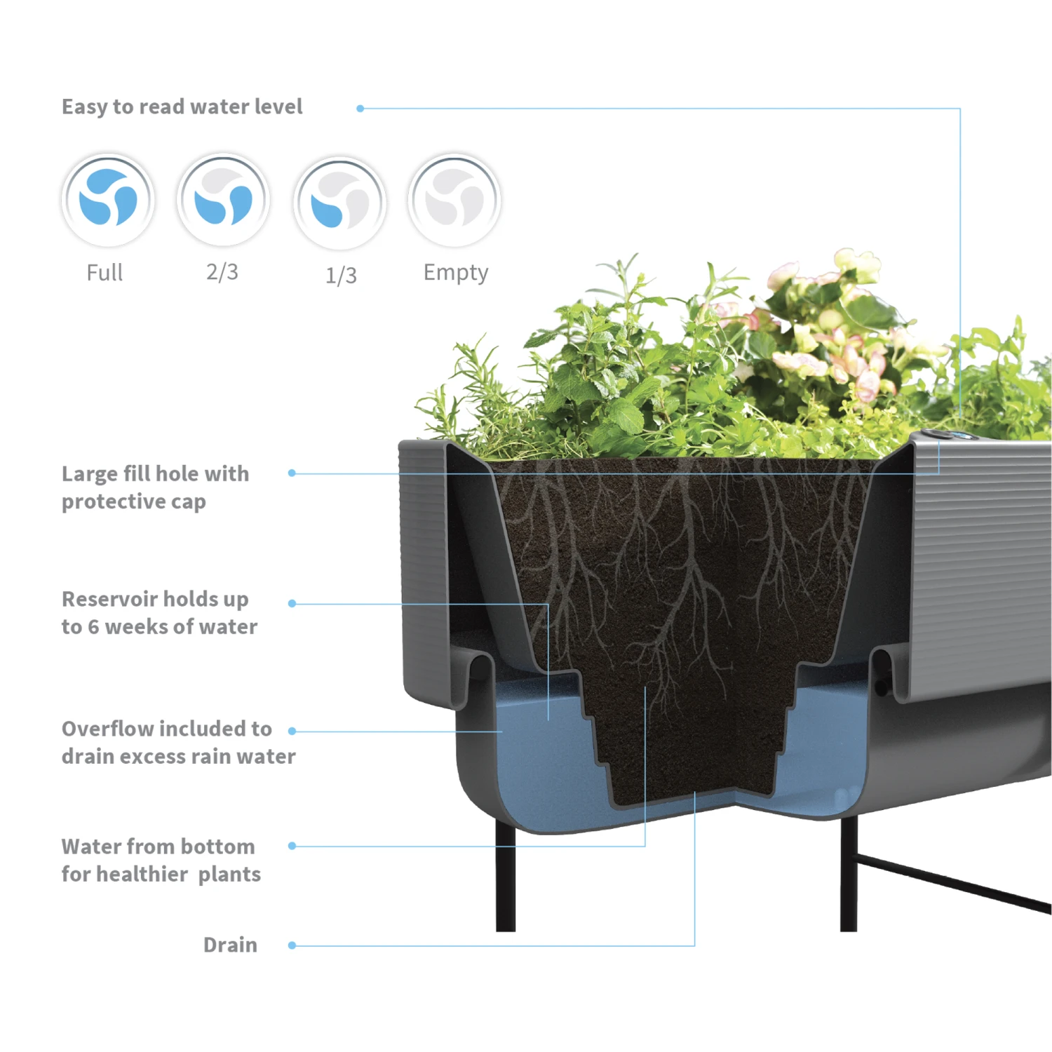 The Crescent TruDrop® reservoir system is a simple solution that will extend time between watering for up to 6 weeks depending on planter size and weather conditions. Each planter comes with an easy-to-read water gauge that alerts you to how much water your container has. The benefit of watering from underneath diminishes risk of fungus growth and leaf damage allowing you to grow healthier plants.