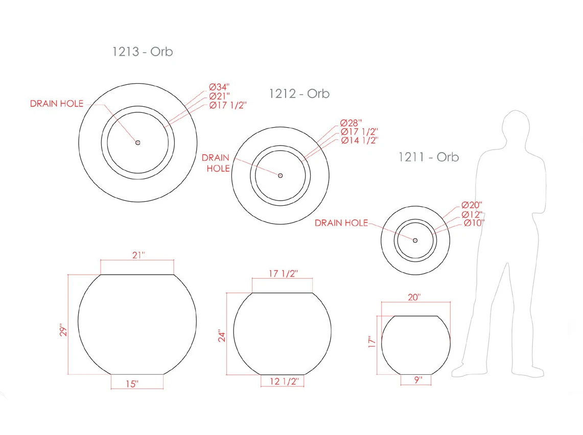 Orb Planters may be crafted from steel, aluminum or Cor-ten steel. 10 standard finish choices as well as custom colors. Offered diameters 20″, 28″ and 34″. An additional 47″ diameter orb will be quoted upon request.