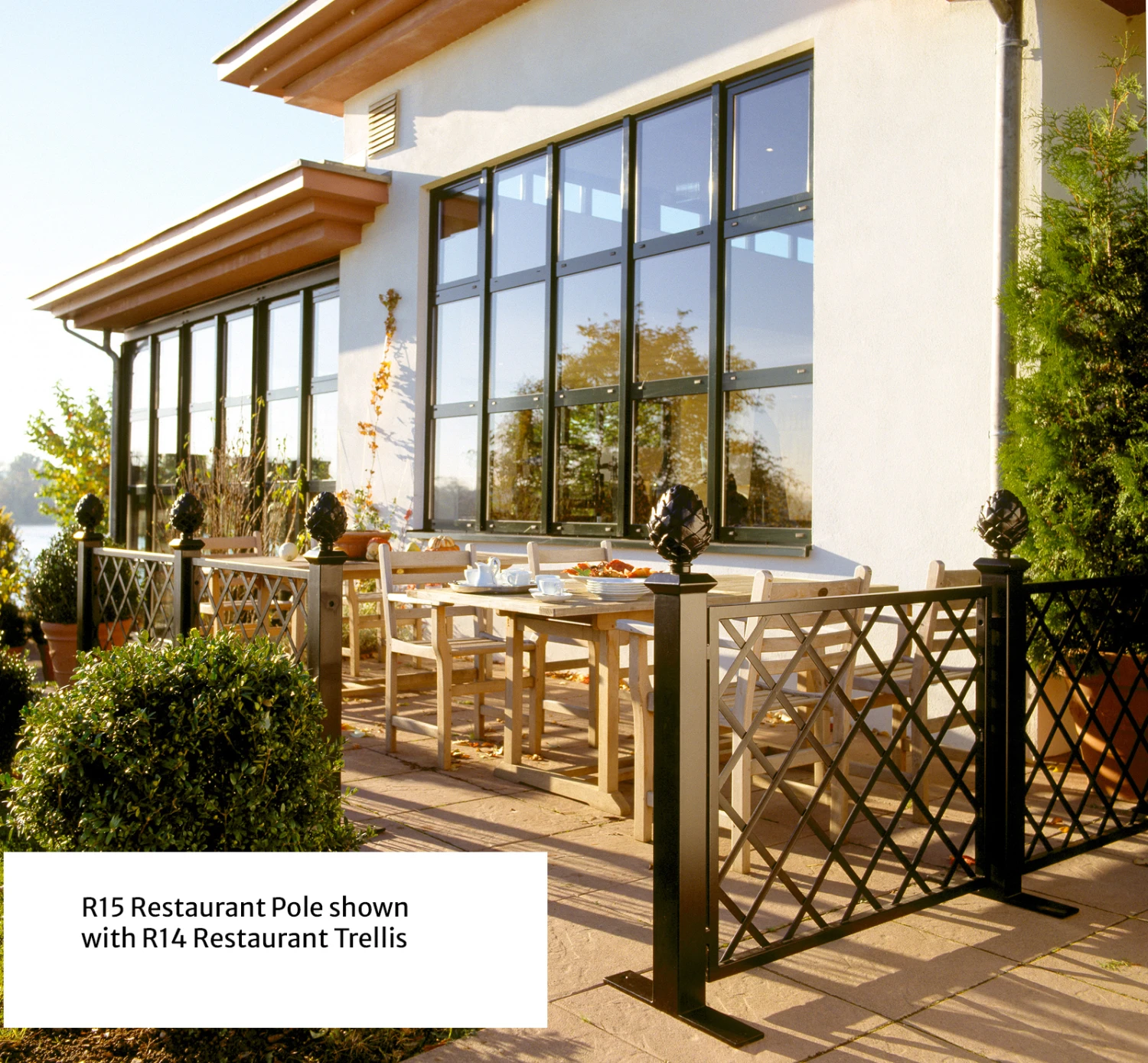 Clear contours and a focus on essentials such as precision and timelessness are the core design principles embodied in the Restaurant Trellis Divider. Modern and yet classical. A stylish solution in steel for anyone wishing to create an atmosphere of repose – in hotel grounds, restaurants, golf clubs or simply a small privacy screen for your patio or terrace.