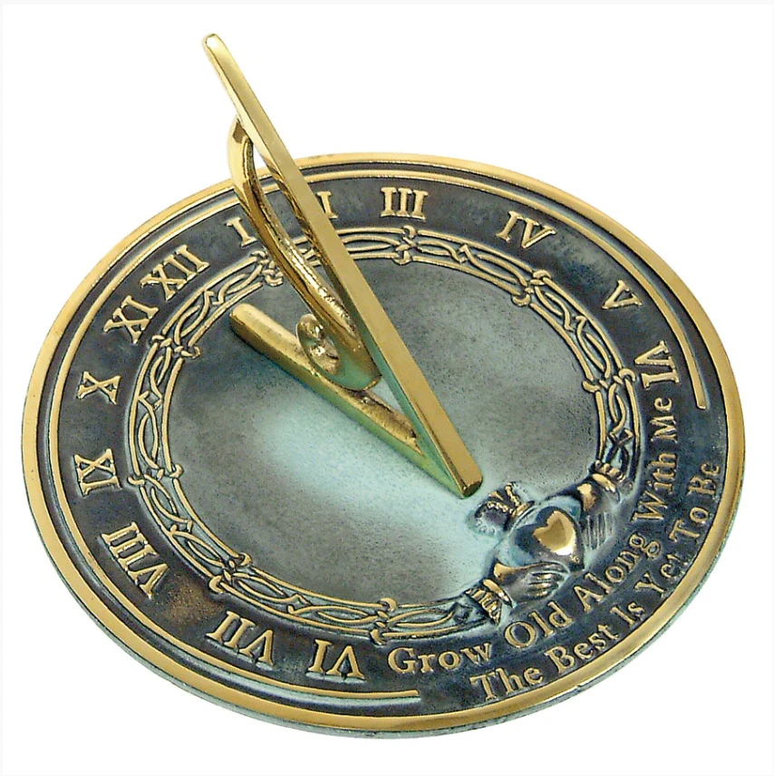 The Grow Old with Me sundial is crafted from solid brass and given verdigris and polished highlights and has a 10″ diameter. The Robert Browning’s poem “Grow old along with me, the best is yet to be” is probably the most loved quotation that we use on sundials. This solid brass sundial has a knot work design and a beautiful Irish claddagh centerpiece, which symbolizes everlasting love.