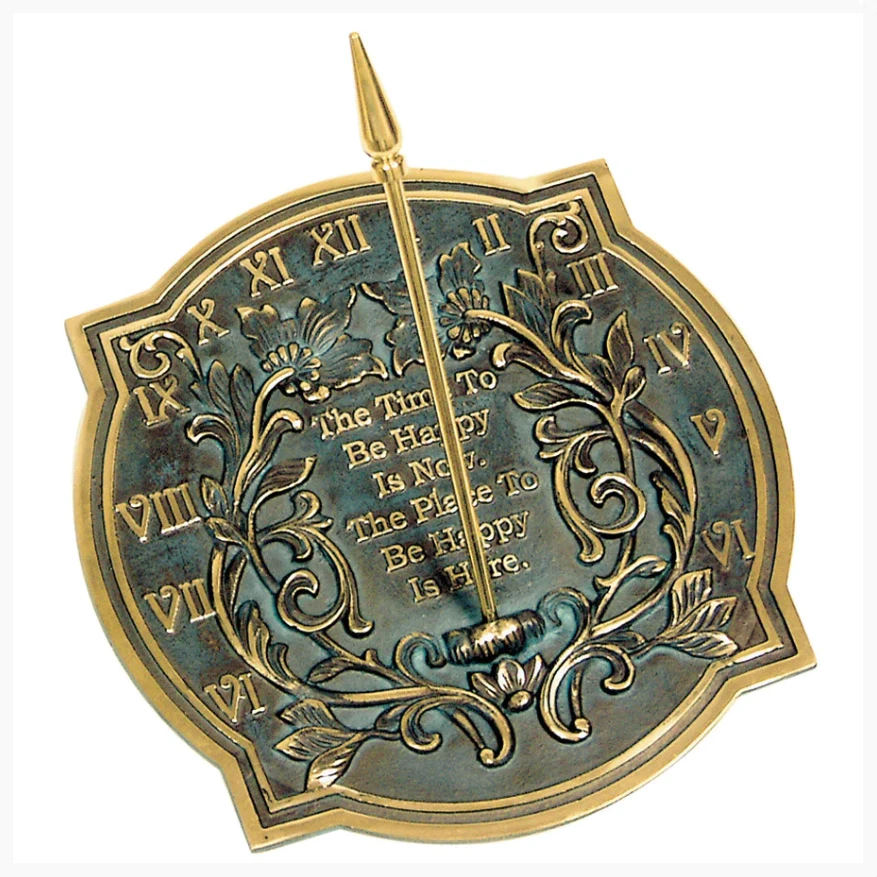 Sold brass sundial embossed with “The time to be happy is now. The place to be happy is here”, a life-affirming motto on a 10″ diameter sundial. The words are enveloped by a block print style floral design that gives a traditional feeling to the sundial. The bold yet simple gnomon is a tasteful complement to the dial face.