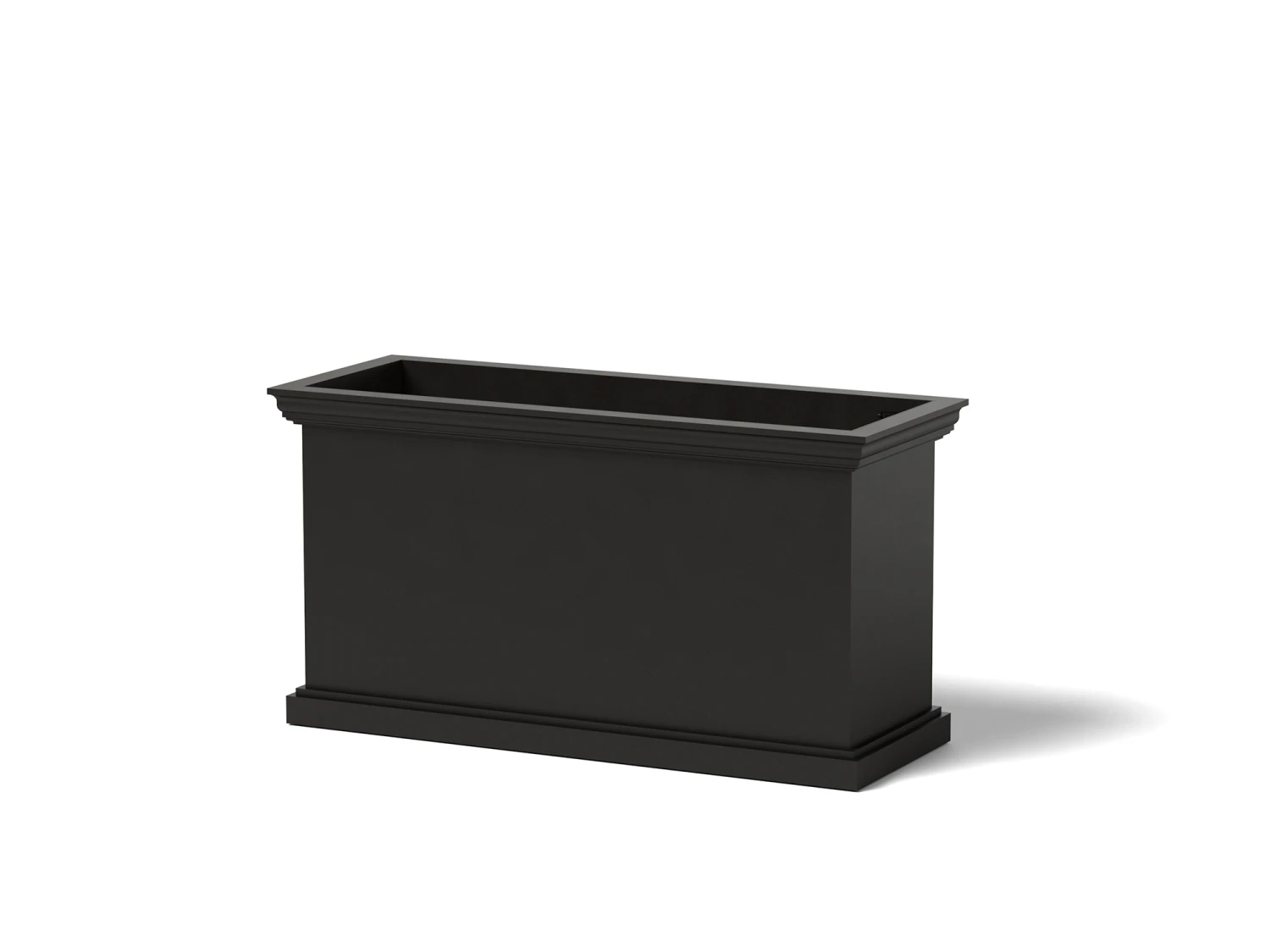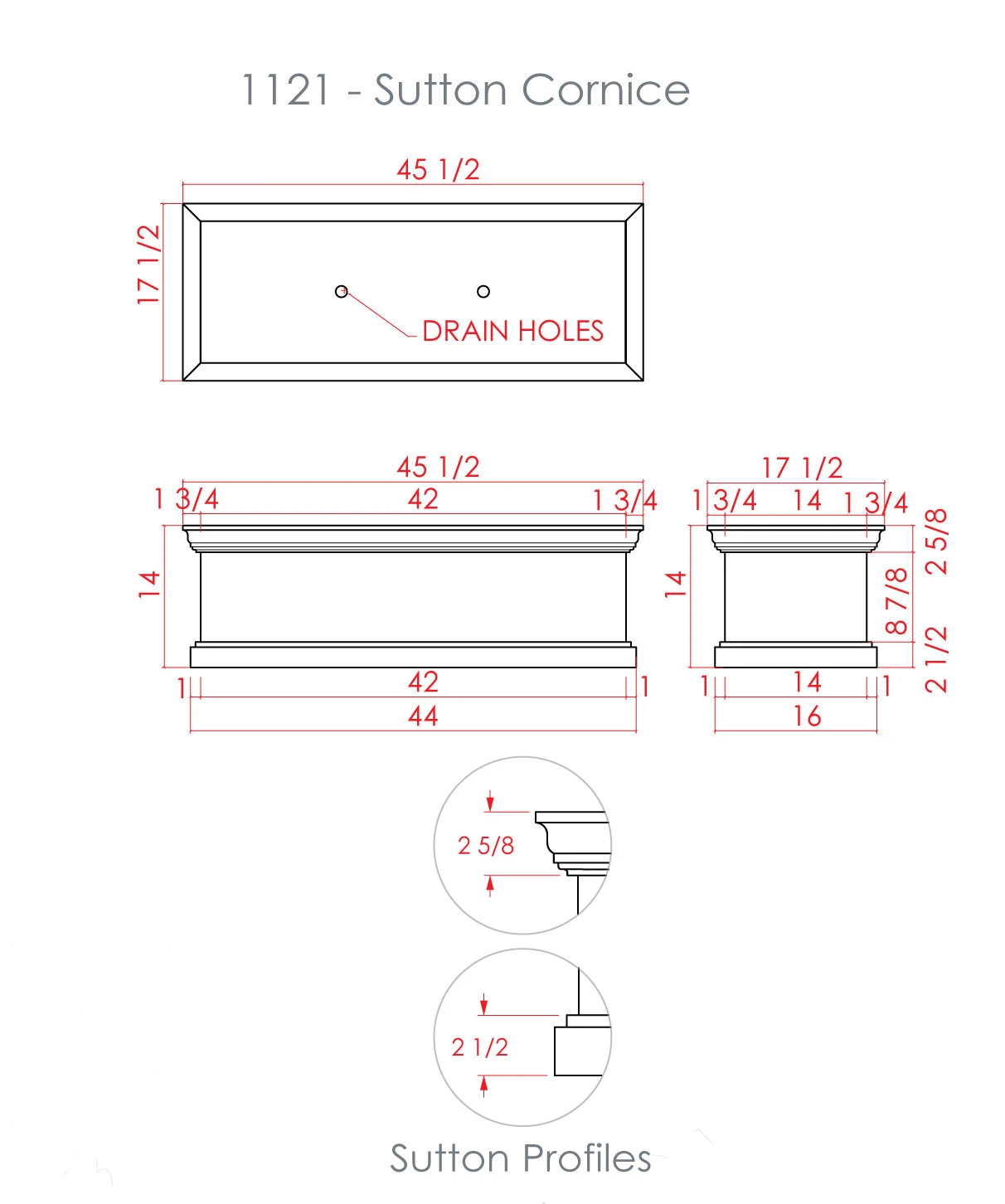 The Sutton Cornice planter measures 45.5in L x 17.5in W x 14in H and is crafted from lightweight aluminum and offered in 8 standard powder coat colors as well as custom RAL colors and oxidized zinc. Perfect for setting along a deck or patio.