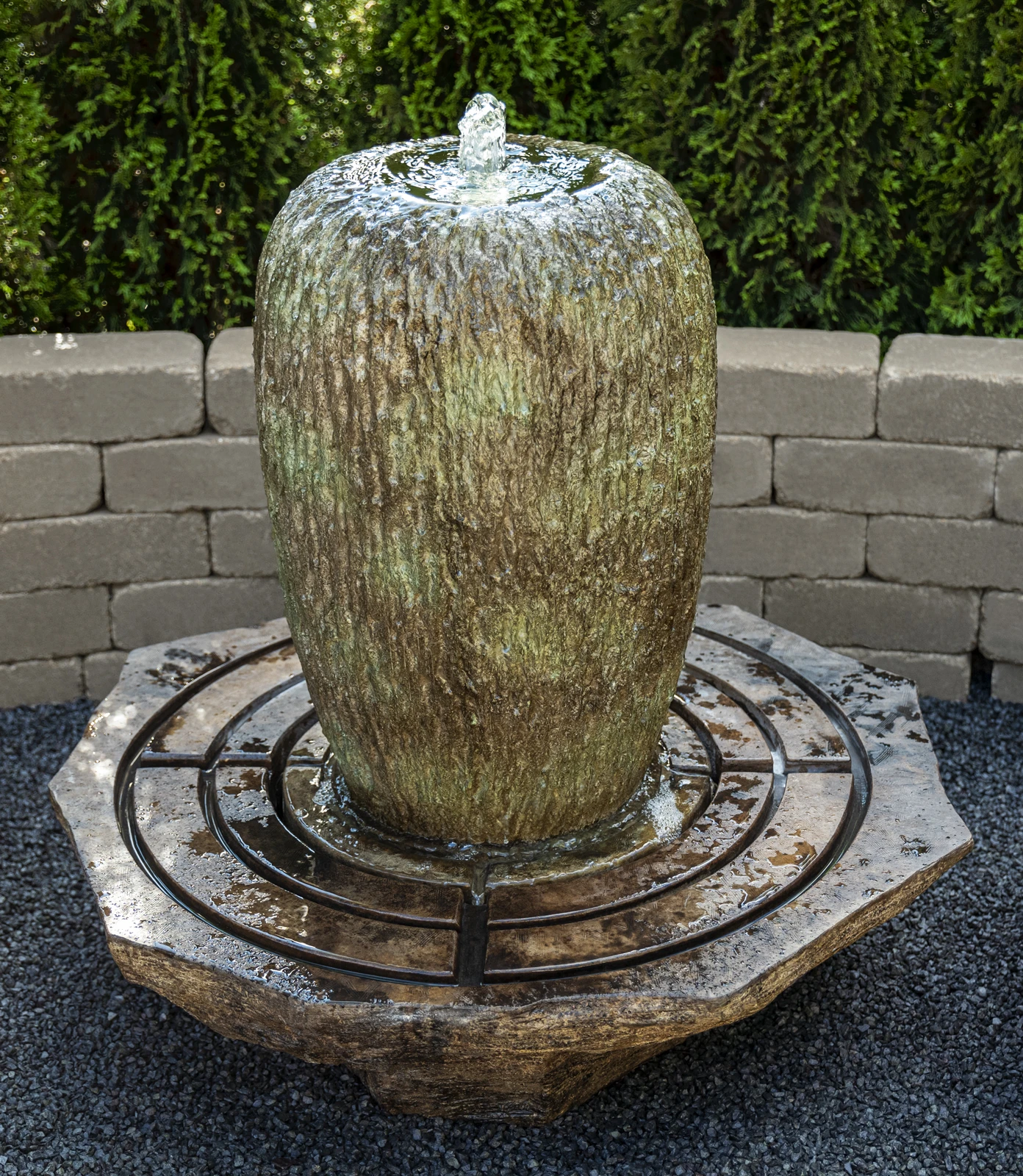 This rustic yet modern design combines free form shapes with the symmetry of concentric circles, creating a rough-hewn look with great artistic appeal. Water bubbles up then gently flows over the tall central pillar, reminiscent of a natural spring.
