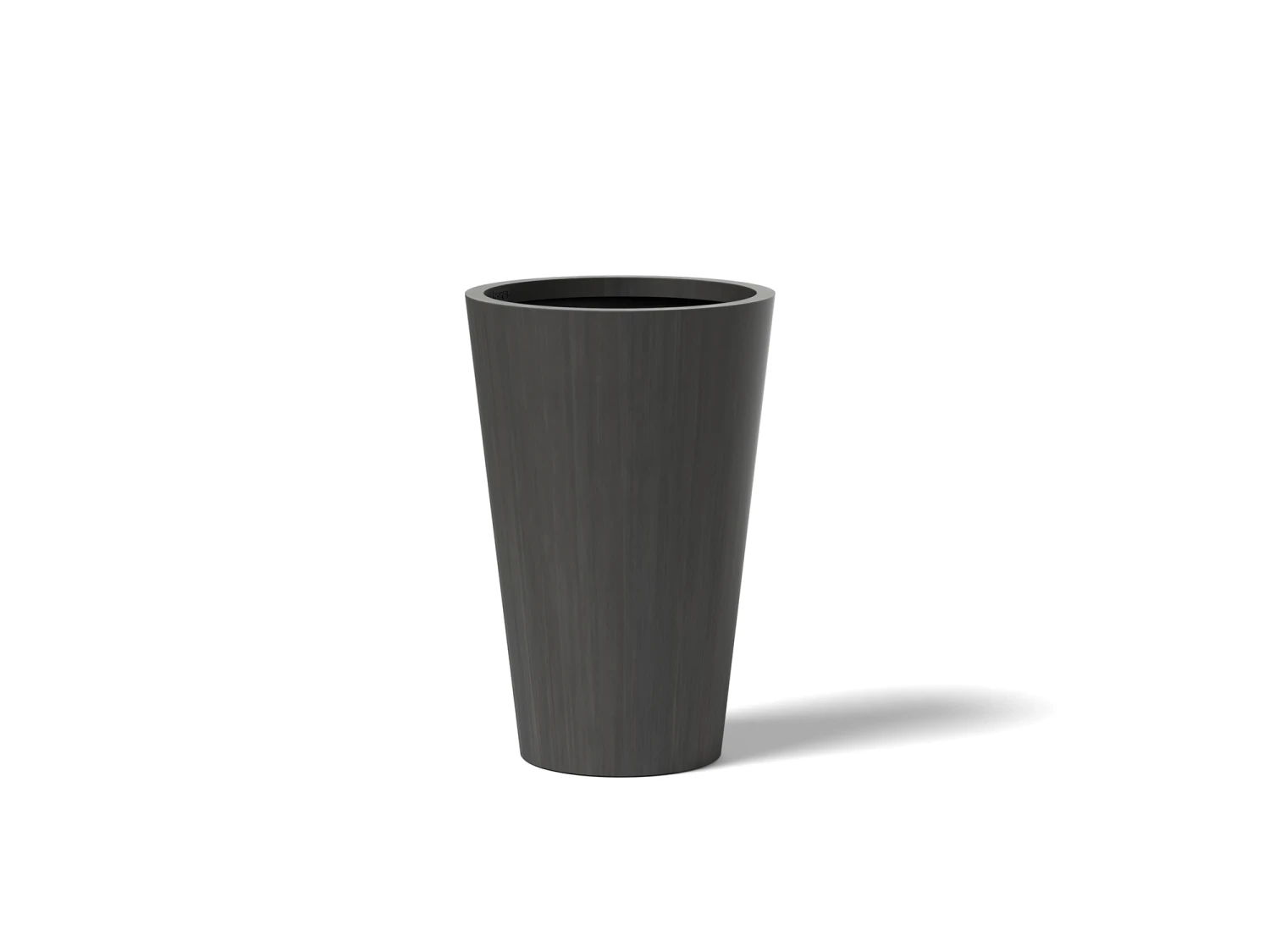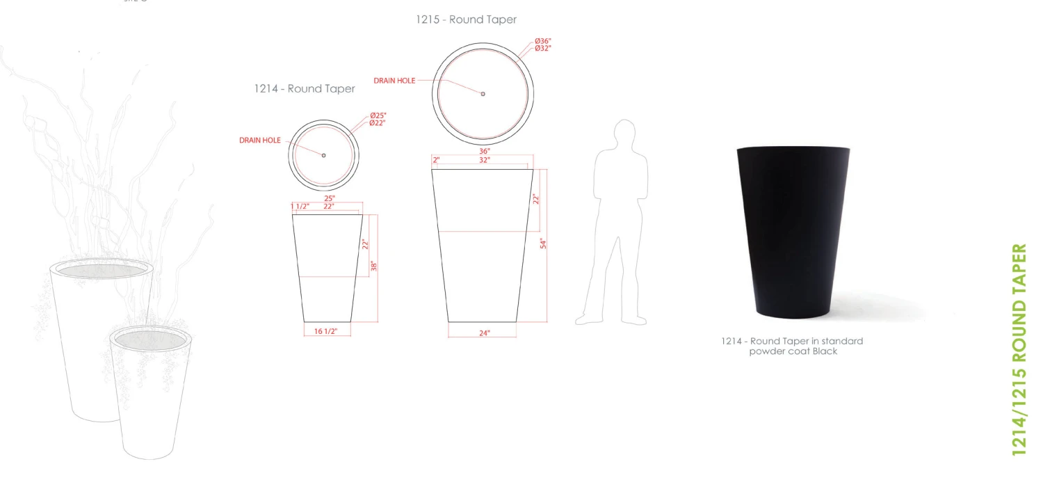 The Tall Round Taper planters measure 25in x 38in and 36in x 54in and are offered in steel, aluminum or Cor-ten steel. The aluminum is offered in 10 standard finish choices. Custom powder coat colors available upon request.