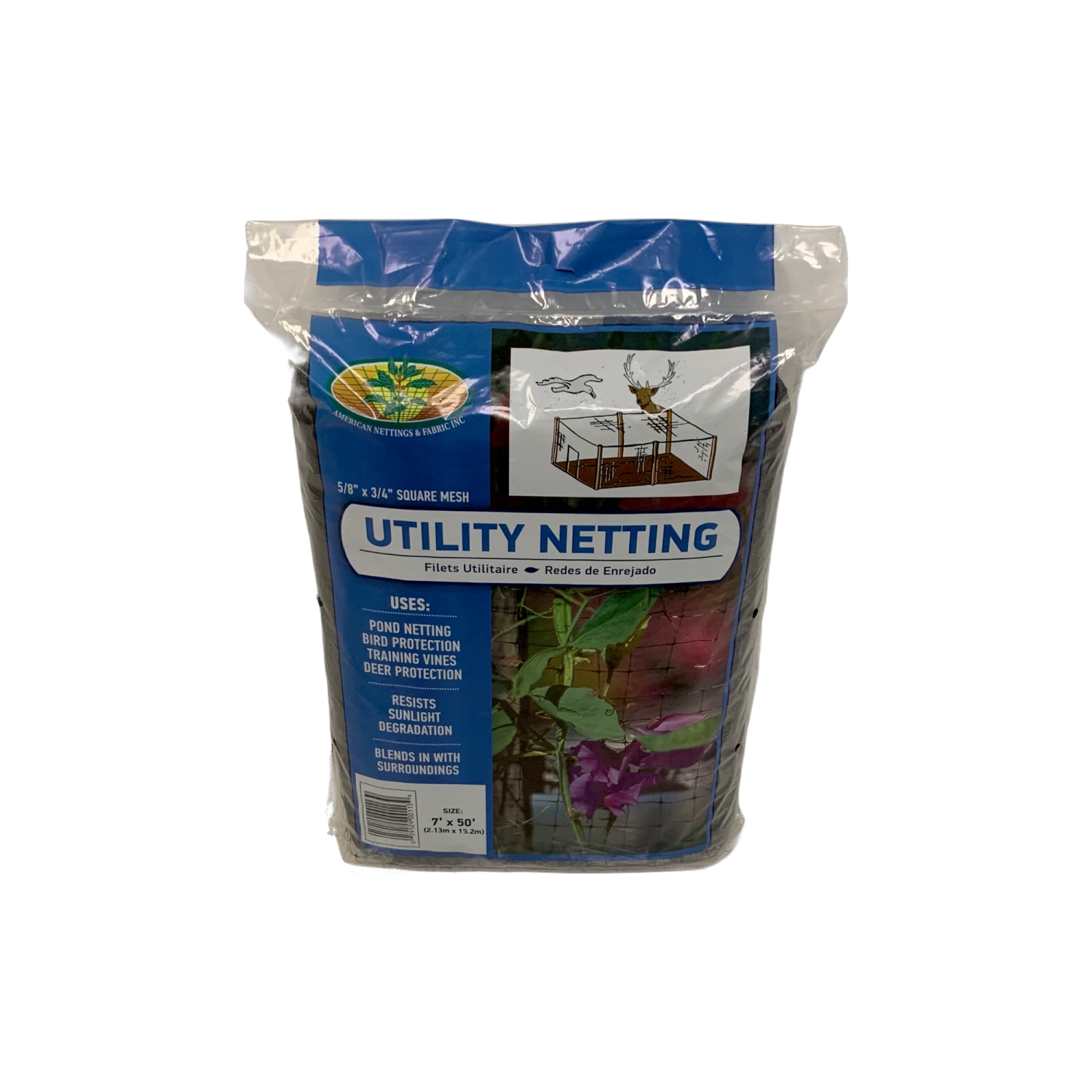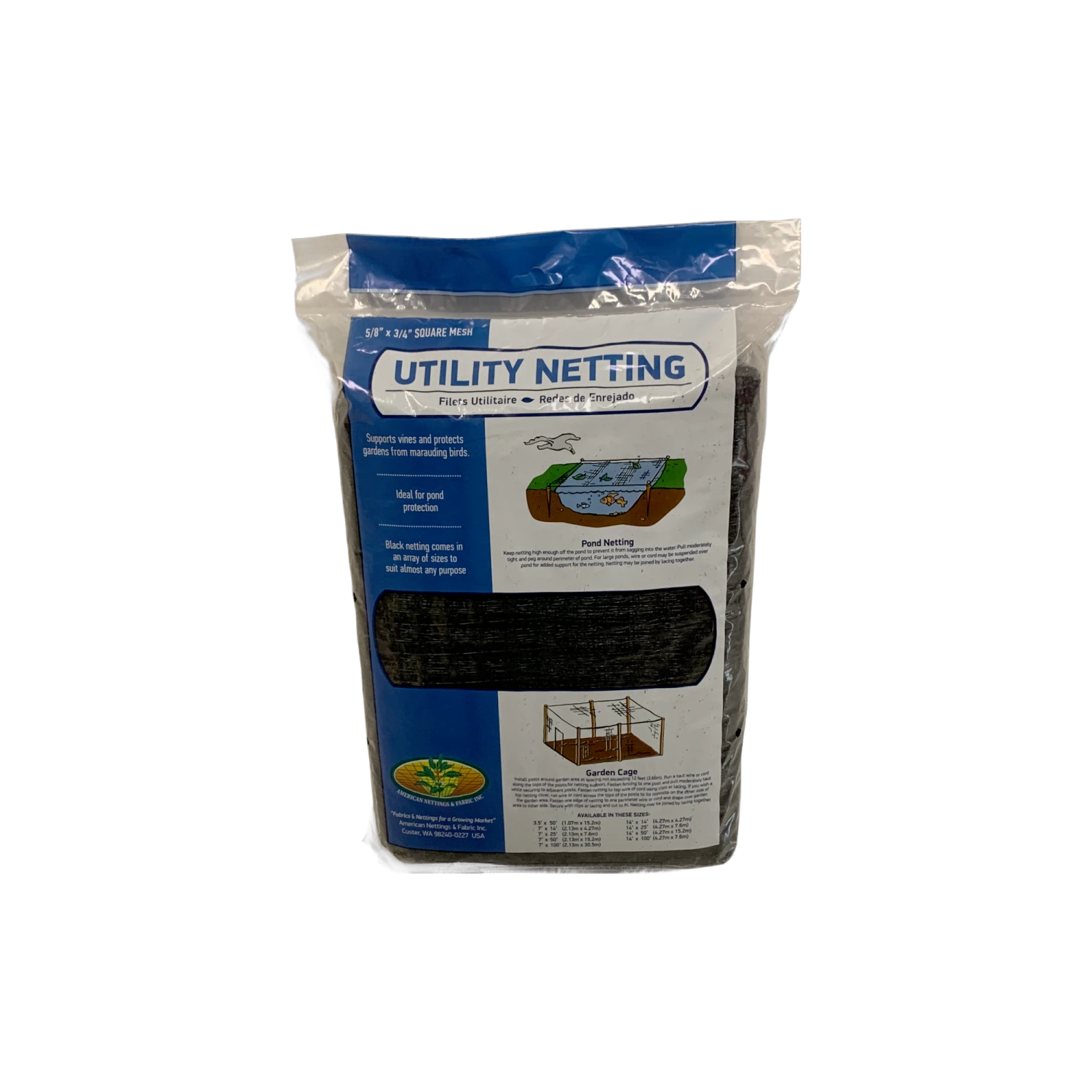 A black utility netting ideal for pond protection or creating a garden “cage” offering protection from birds, deer and other animals. UV resistant. Mesh measures 5/8” x 3/4”. Roll 7’ x 50’