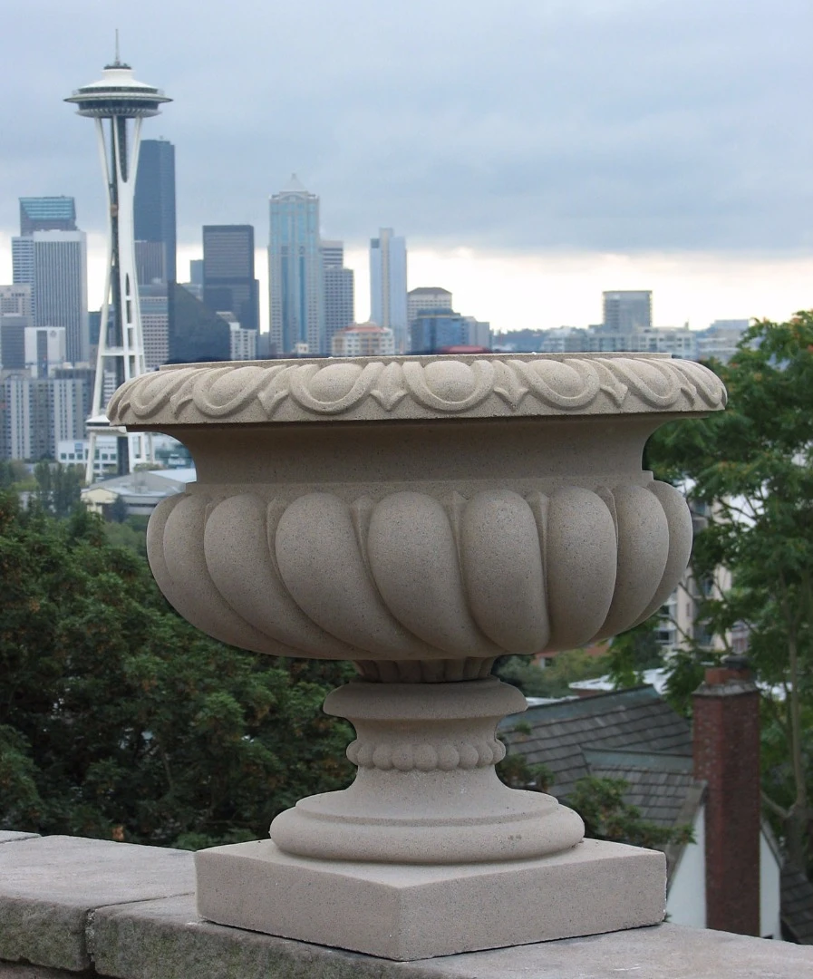 The Vulliamy Vase is a striking cast stone urn. The rim is decorated with the classic egg and dart design.