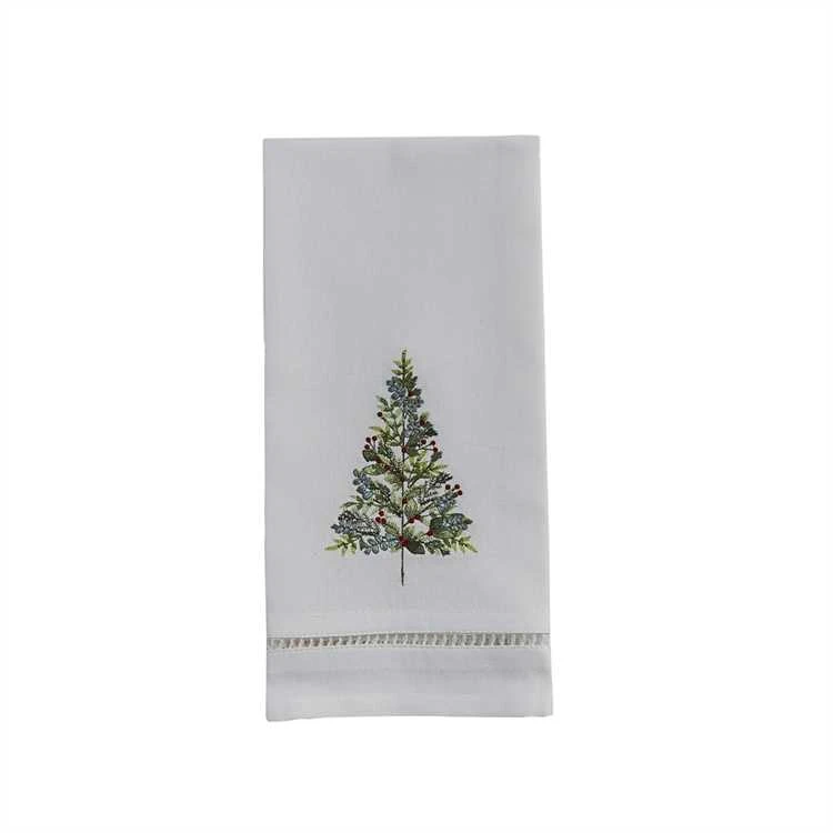 Beautiful embroidered Winter Berry Tree on solid white cotton dish towel.